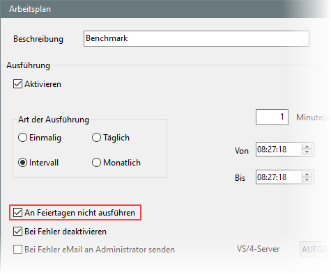 Für einige Aufgaben im Aufgabenplaner kann es sinnvoll sein, diese an Feiertagen zu pausieren. Hierfür steht im Aufgabenplaner die Funktion "An Feiertagen nicht ausführen" zur Verfügung.