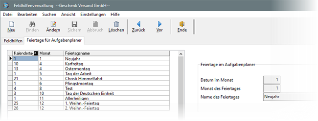 Damit diese Funktion korrekt angewendet wird, müssen am Anfang eines Jahres die Feiertagstabelle überarbeitet und die Feiertage an das laufende Jahr sowie an das eigene Bundesland angepasst werden. Diese Definition können Sie über die Feldhilfenverwaltung im VS/4 vornehmen.