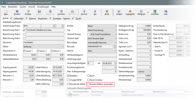 Um diese Faktoren bei der Kartonermittlung berücksichtigen zu können, wurde mit der Version 4.6.10 das Feld "Knautschfaktor anwenden" integriert.