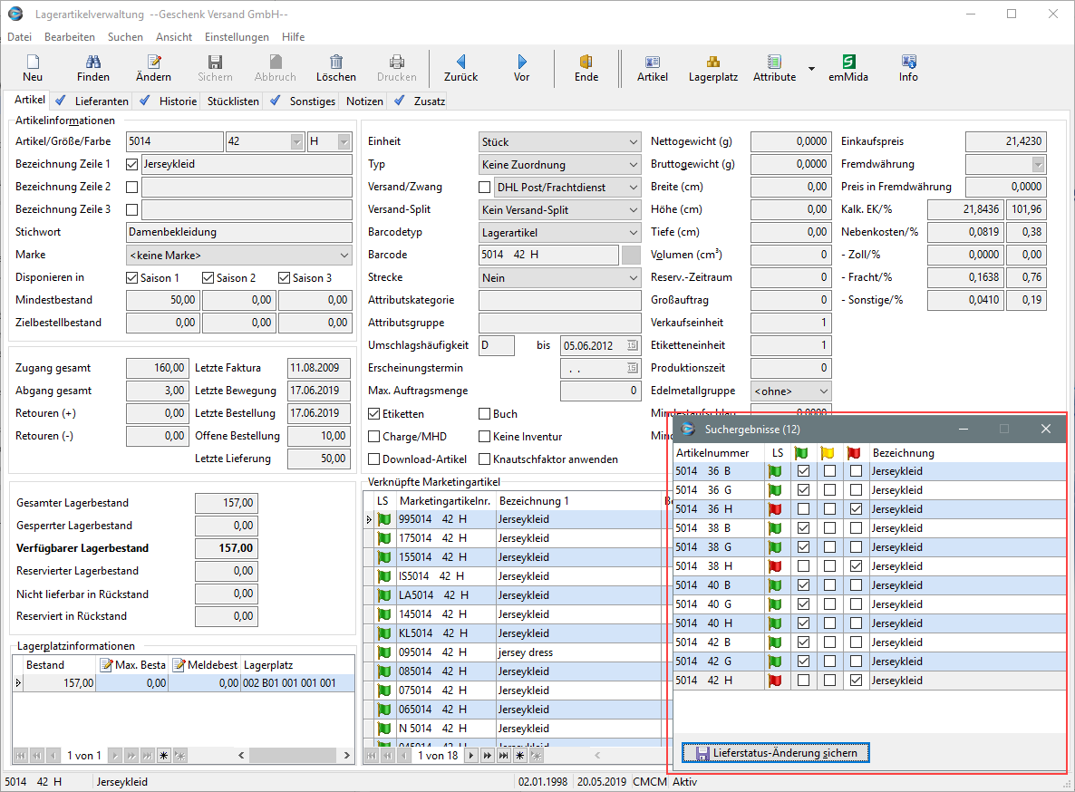 Wird dieser ausgewählt, wird die Suchmaske geschlossen und eine weitere Maske mit den Suchergebnissen zusätzlich zur Lager- bzw. Marketingartikelmaske angezeigt. Zur Detailanzeige eines anderen Artikels genügt es nun, diesen mit der Maus oder über die Tastatur in der Liste auszuwählen.