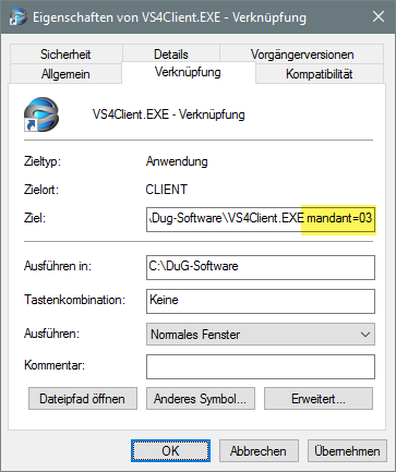 Im VS/4 besteht die Option einen Mandanten direkt aufzurufen, ohne dass zuvor vom Benutzer über die Anmeldemaske die Mandantenauswahl getroffen werden muss. Dies empfiehlt sich bei PCs von Mitarbeitern, die ausschließlich innerhalb eines bestimmten Mandanten arbeiten müssen, z. B. die Kassenbenutzer im entsprechenden Laden-Mandanten. Hierfür muss in den Eigenschaften der Verknüpfung VS/4Client.exe das Ziel um den Zusatz "Mandant=nn" erweitert werden. "nn" steht hierbei für die gewünschte Mandantennummer aus der Auswahlliste.